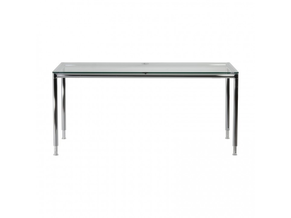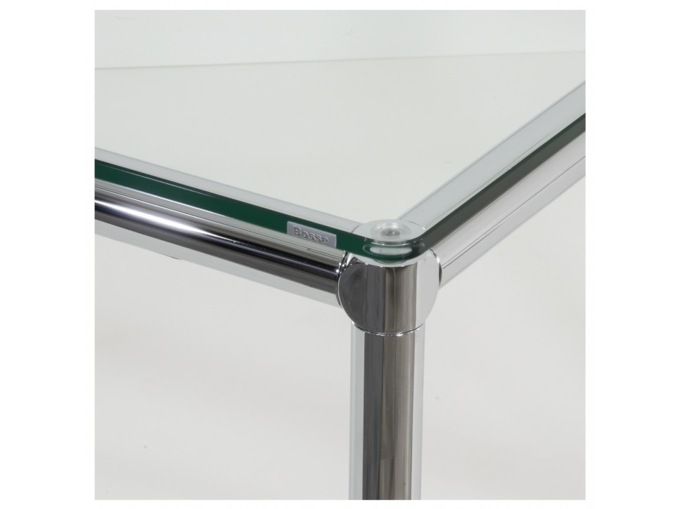 Der Schreibtisch BOSSE S-DESK kombiniert eine klare Glasplatte mit einem stabilen chromfarbenen Stahlrundrohrgestell.