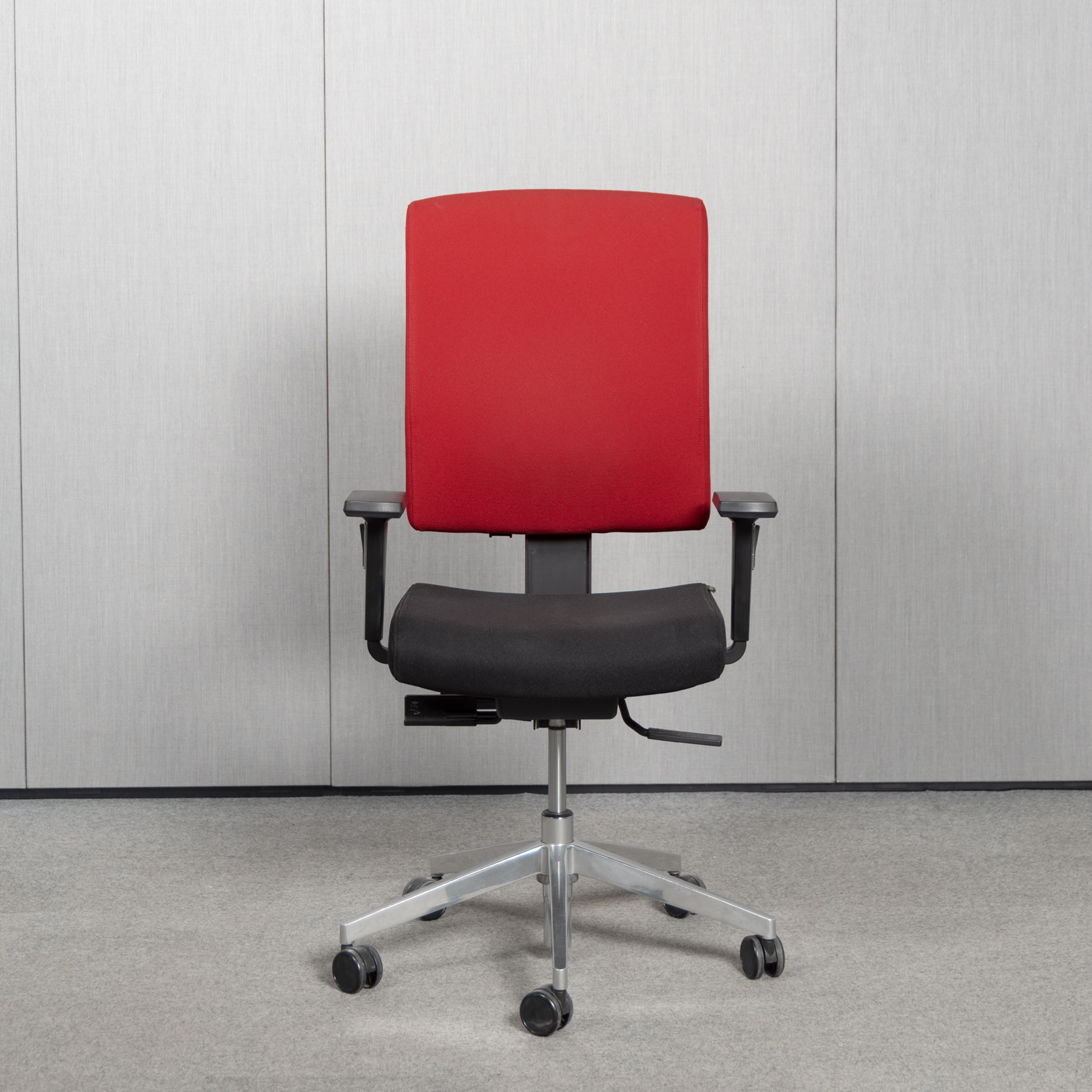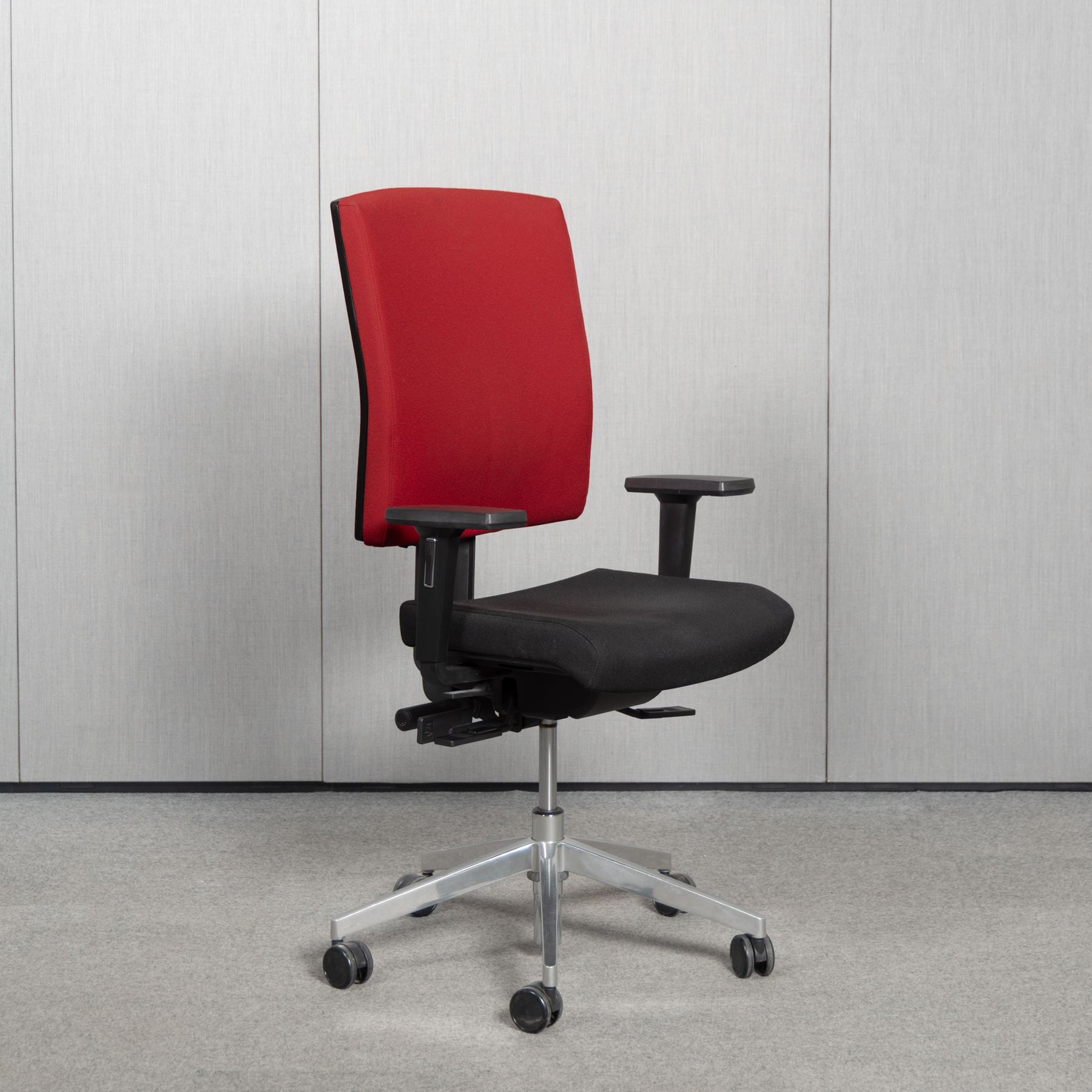 Der @just evo operator von Dauphin ist als Bürodrehstuhl für den professionellen Arbeitsplatz konzipiert und kombiniert die Synchrontechnik Synchro-Evolution mit präzisen Einstellmöglichkeiten. Die Rückenlehne ist höhenverstellbar und wird durch eine einstellbare Lumbalstütze ergänzt, um den unteren Rücken gezielt zu unterstützen. Für die Anpassung an unterschiedliche Sitzpositionen stehen Sitztiefeneinstellung und Sitzneigeverstellung zur Verfügung. Die 2F-Armlehnen mit PU-soft Armauflagen bieten eine funktionale Unterstützung der Arme im Arbeitsalltag. Die Ausführung in Stoff Schwarz mit rotem Rücken wird durch ein poliertes Aluminium-Fußkreuz und die polierte Gasfeder abgerundet; verbaut ist eine neue Rückengasdruckfeder.