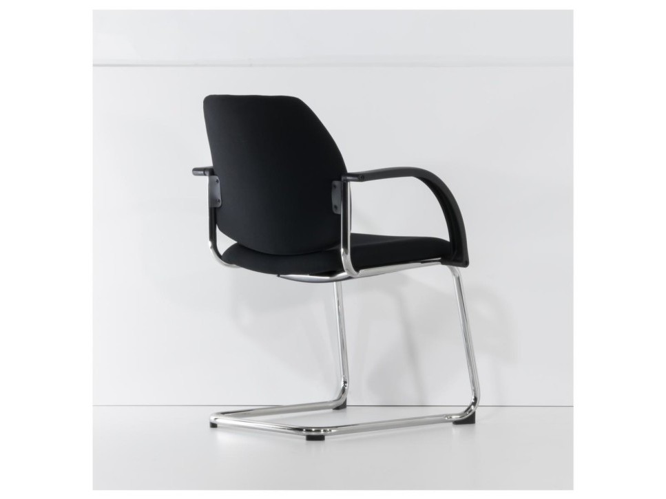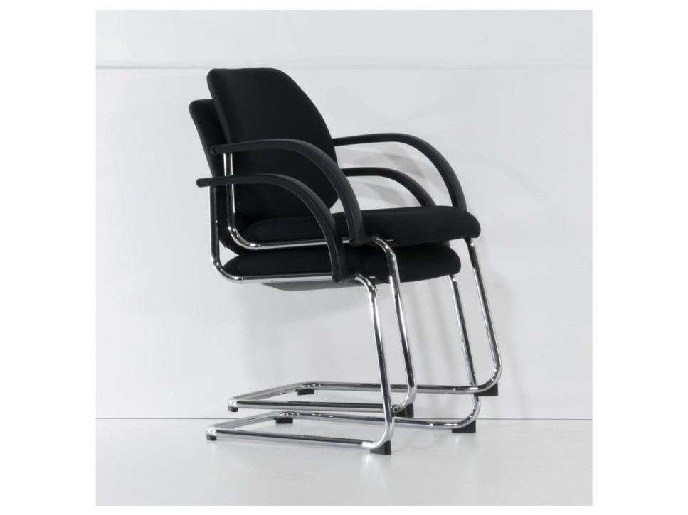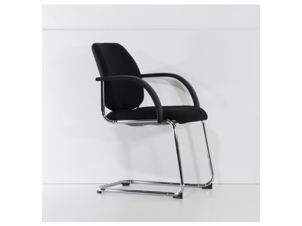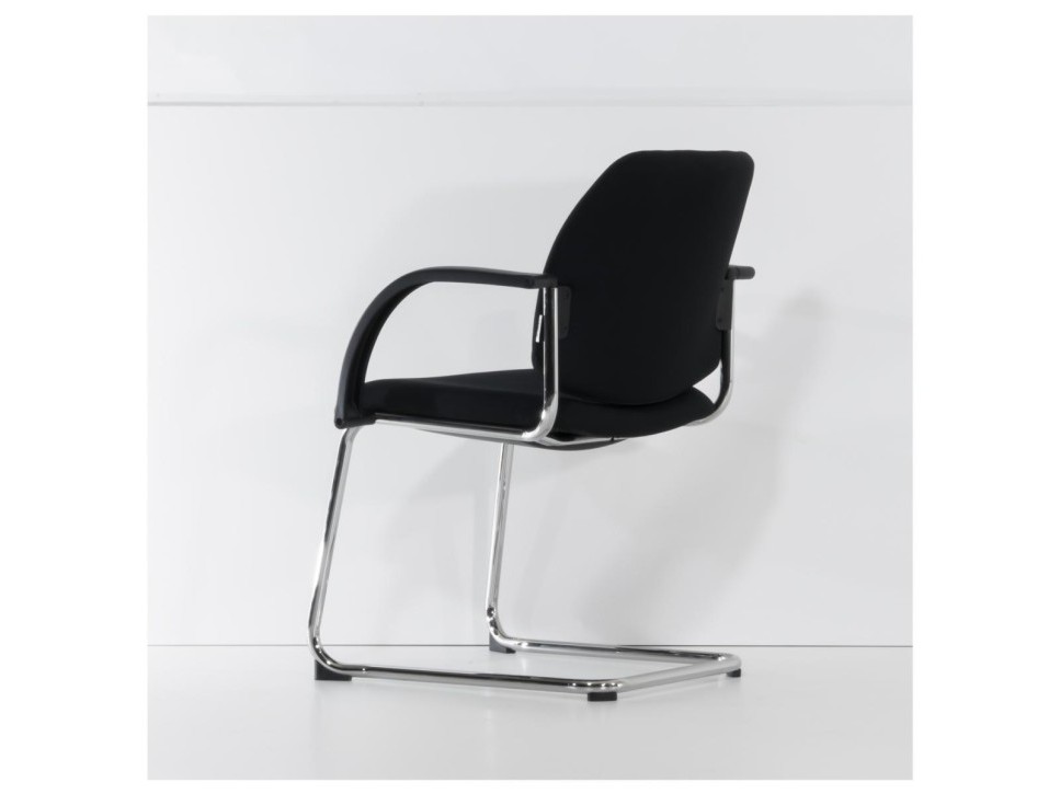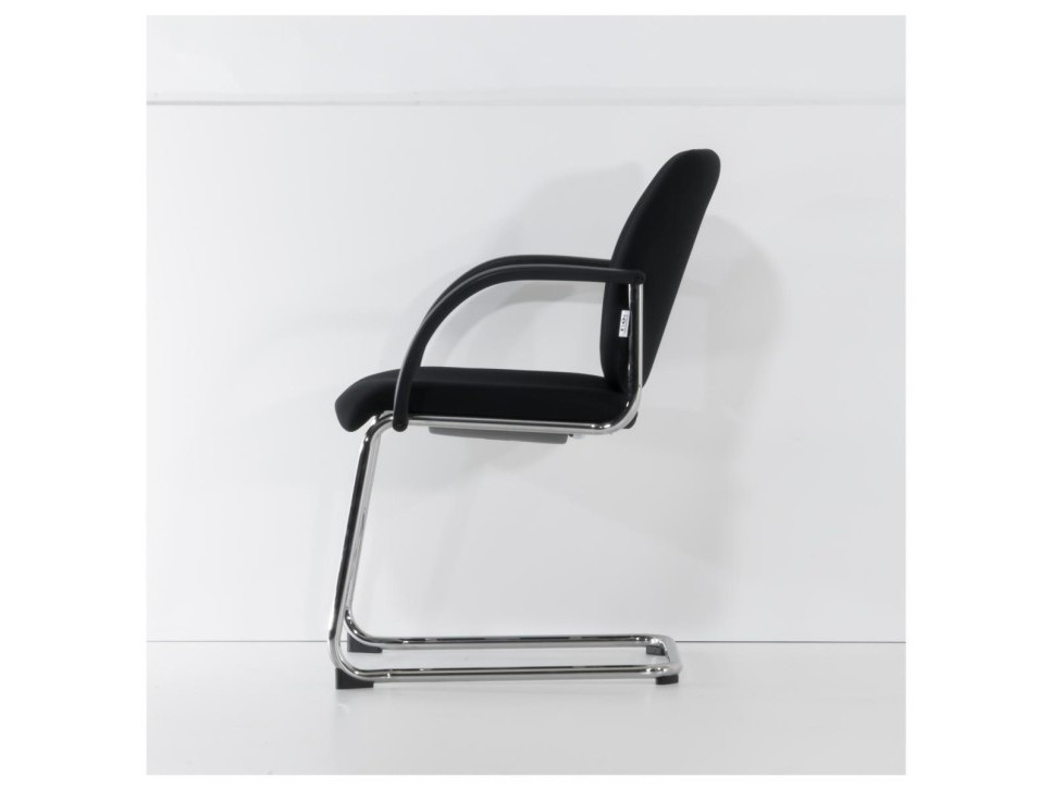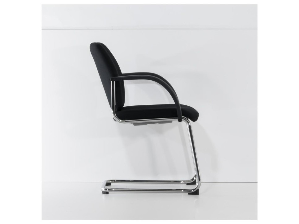 Das Freischwingergestell aus verchromtem Stahlrundrohr verleiht dem Stuhl eine angenehme Flexibilität und sorgt gleichzeitig für Stabilität. Die gepolsterte Sitz- und Rückenfläche unterstützt eine entspannte Körperhaltung, während die ergonomische Formgebung längeres Sitzen in Meetings erleichtert. Die integrierten Armlehnen aus schwarzem Kunststoff bieten zusätzlichen Komfort und fügen sich harmonisch in das Gesamtbild ein.