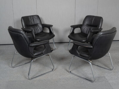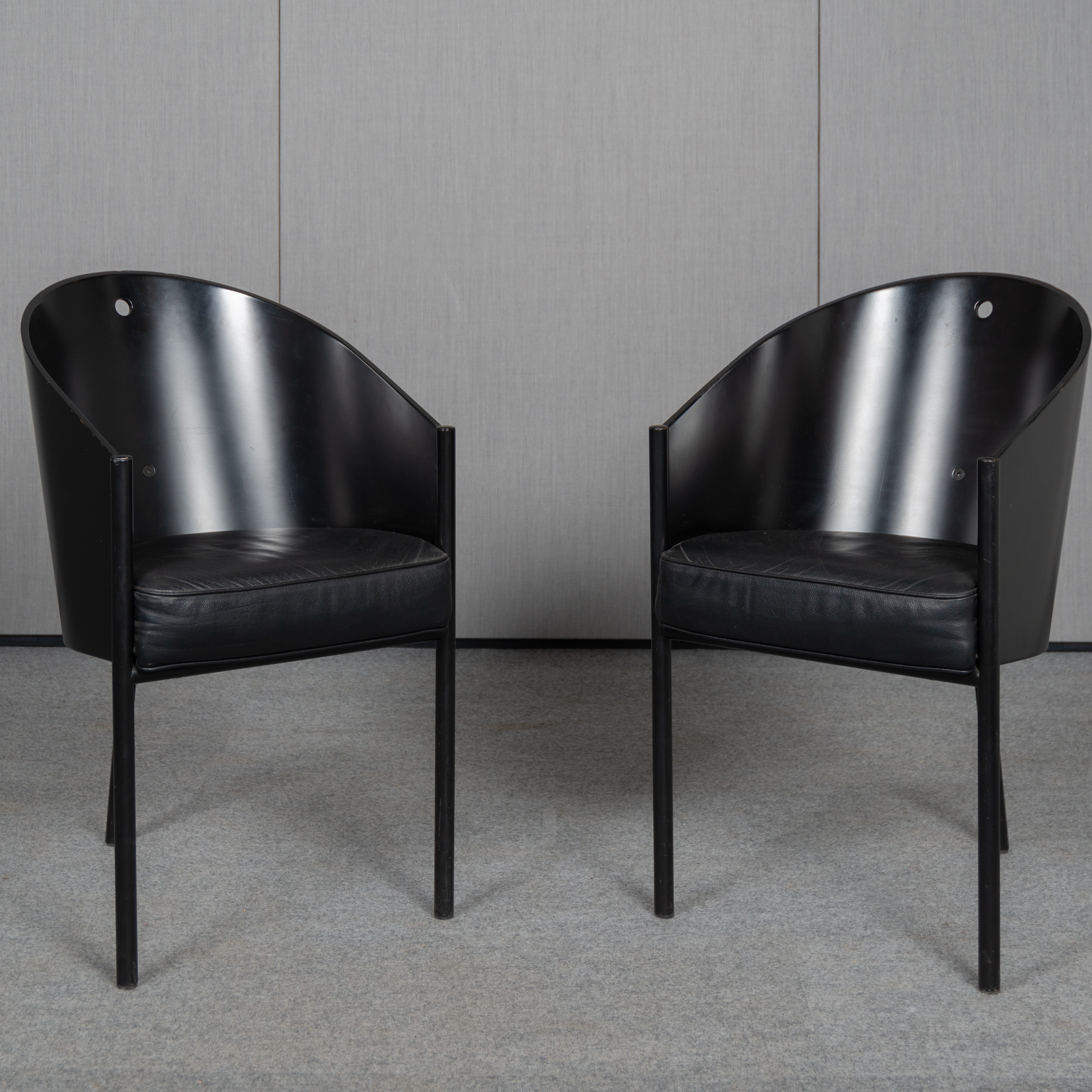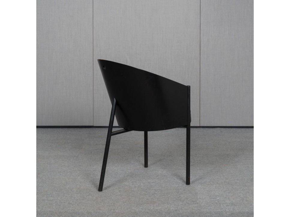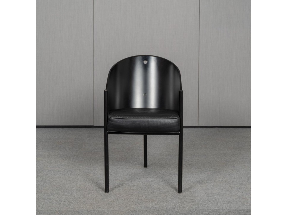 Das Sitzpolster ist mit schwarzem Leder bezogen. Der Stuhl zeigt die für Starck typische Verbindung aus reduzierter Formensprache und markanten Materialien.