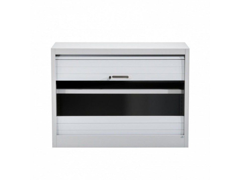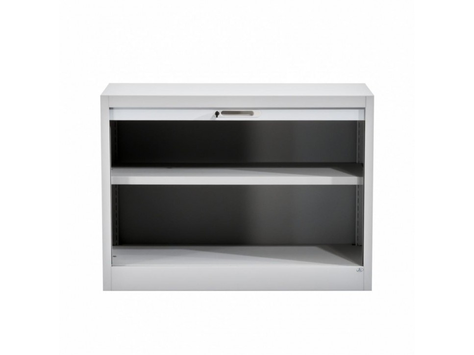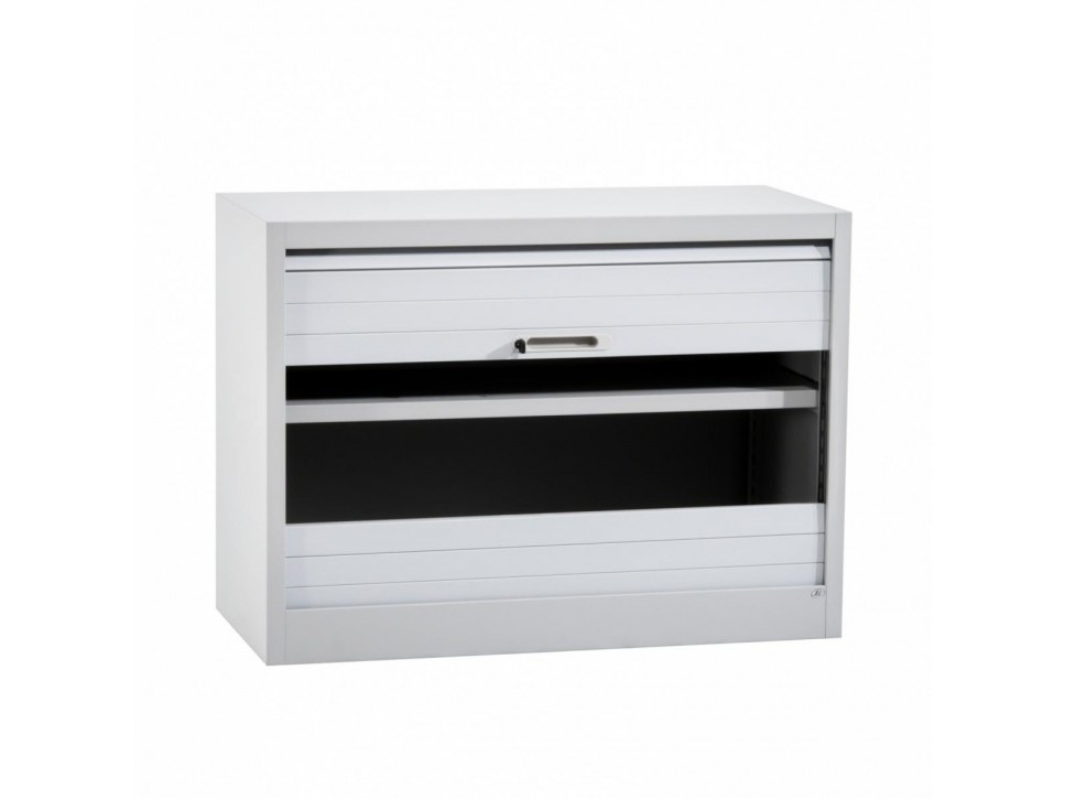 Die vertikale Rollfront öffnet leichtgängig und spart wertvollen Raum im Büro. Der lichtgraue Metallkorpus wirkt sachlich und solide und ist auf dauerhafte Nutzung ausgelegt. Der verstellbare Einlegeboden ermöglicht eine flexible Innenorganisation für Ordner und Arbeitsmaterialien.