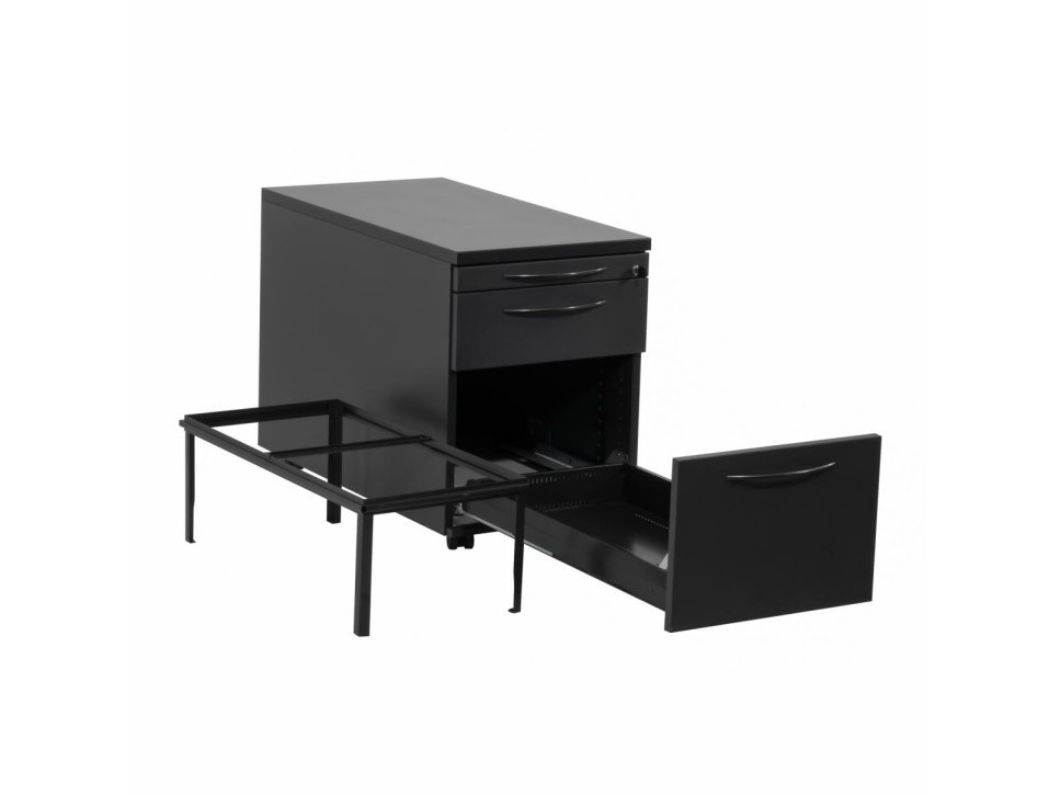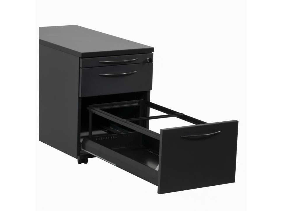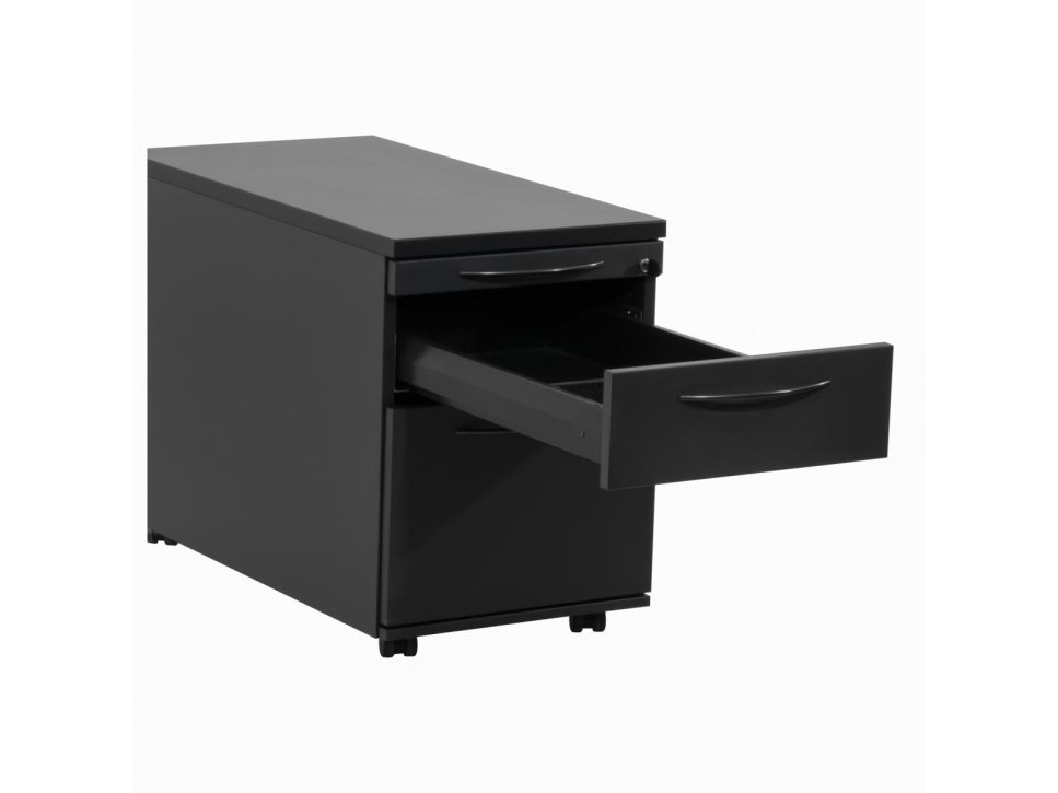 Der Rollcontainer von König + Neurath ist als funktionales Stauraummodul für den Büroalltag konzipiert und passt mit seinen kompakten Abmessungen ideal unter oder neben den Arbeitsplatz. Drei Auszüge bieten klar gegliederten Stauraum; ein Auszug ist für Hängeregistratur ausgeführt. Die Schubladenkästen aus Metall unterstützen eine langlebige Nutzung, während die abschließbare Ausführung Inhalte zuverlässig sichert. Korpus und Deckplatte sind in Melamin Anthrazit gehalten, ergänzt durch anthrazitfarbene Kunststoff-Fronten und passende Griffe in Anthrazit.