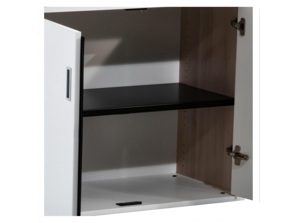 Alle Türen und Schubladen verfügen über Muldengriffe aus Aluminium und sind abschließbar; ein Schlüssel liegt bei. Einstellbare Stellfüße ermöglichen die Anpassung an unterschiedliche Bodenverhältnisse.