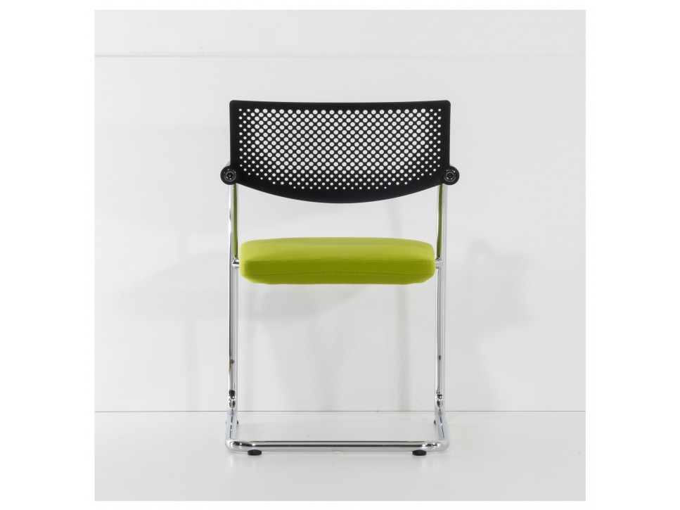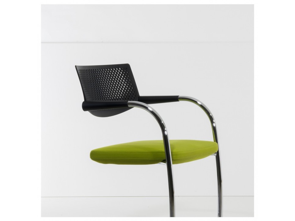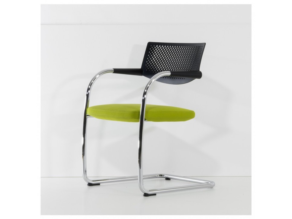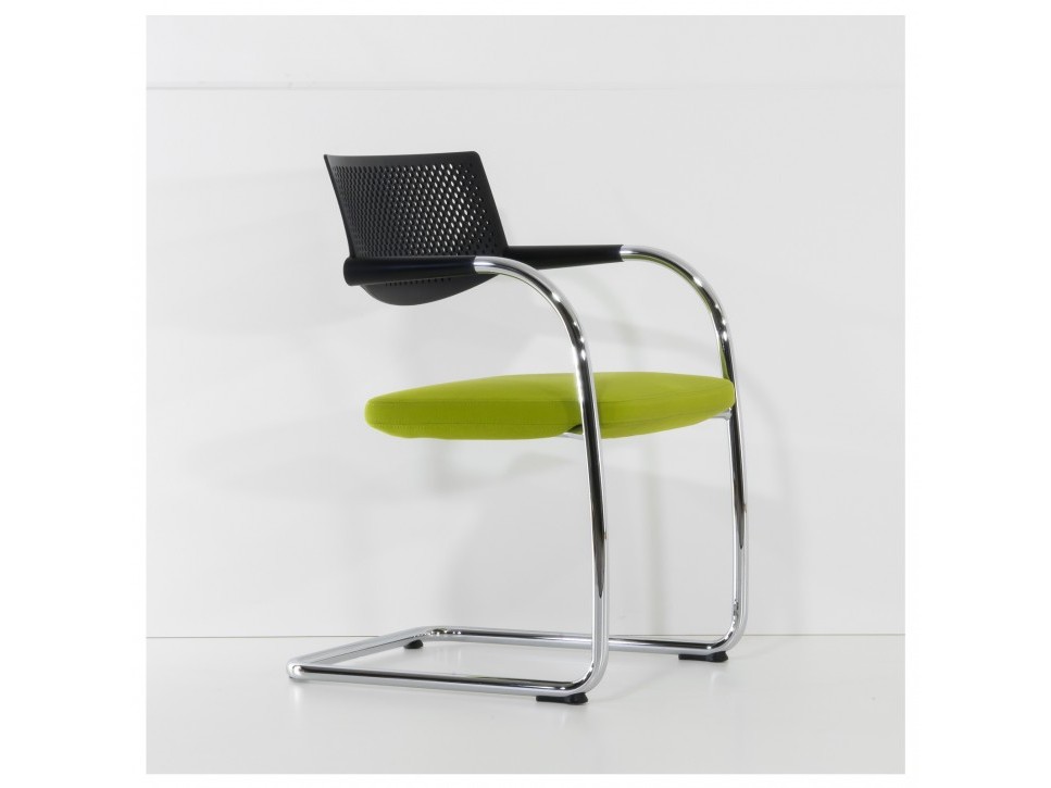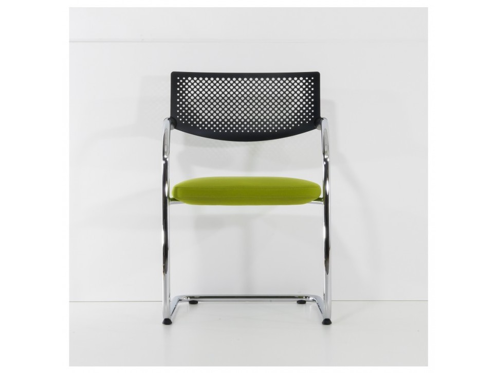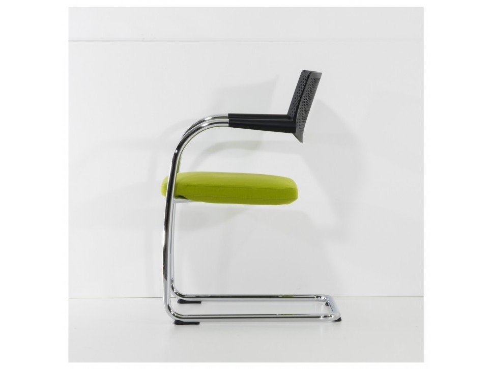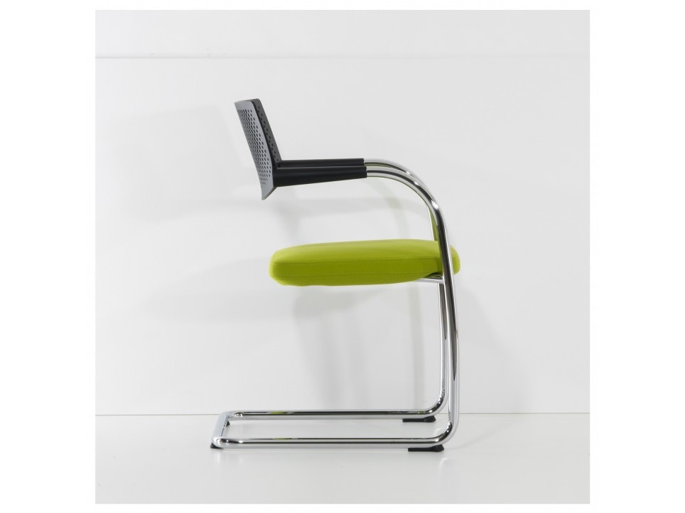 Die Kombination aus verchromtem Stahlrohrgestell, durchbrochener Rückenlehne aus Polyamid und gepolstertem Sitz sorgt für eine klare, funktionale Ästhetik.