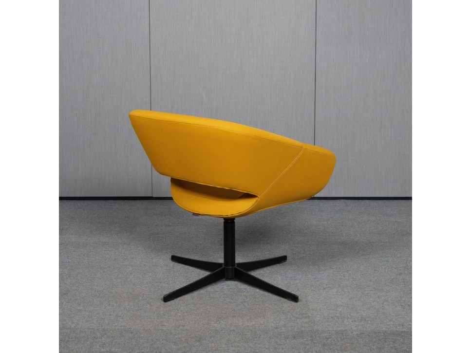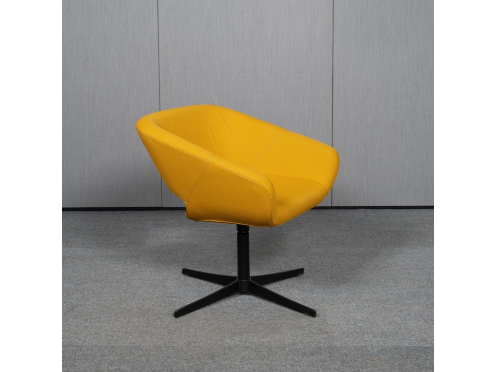 Der honiggelbe Stoffbezug setzt einen warmen Akzent und betont die klare Linienführung des Designs von Rüdiger Schaack. Die Sitzgeometrie ist auf Komfort ausgelegt und bietet eine angenehme Sitztiefe sowie harmonische Proportionen.