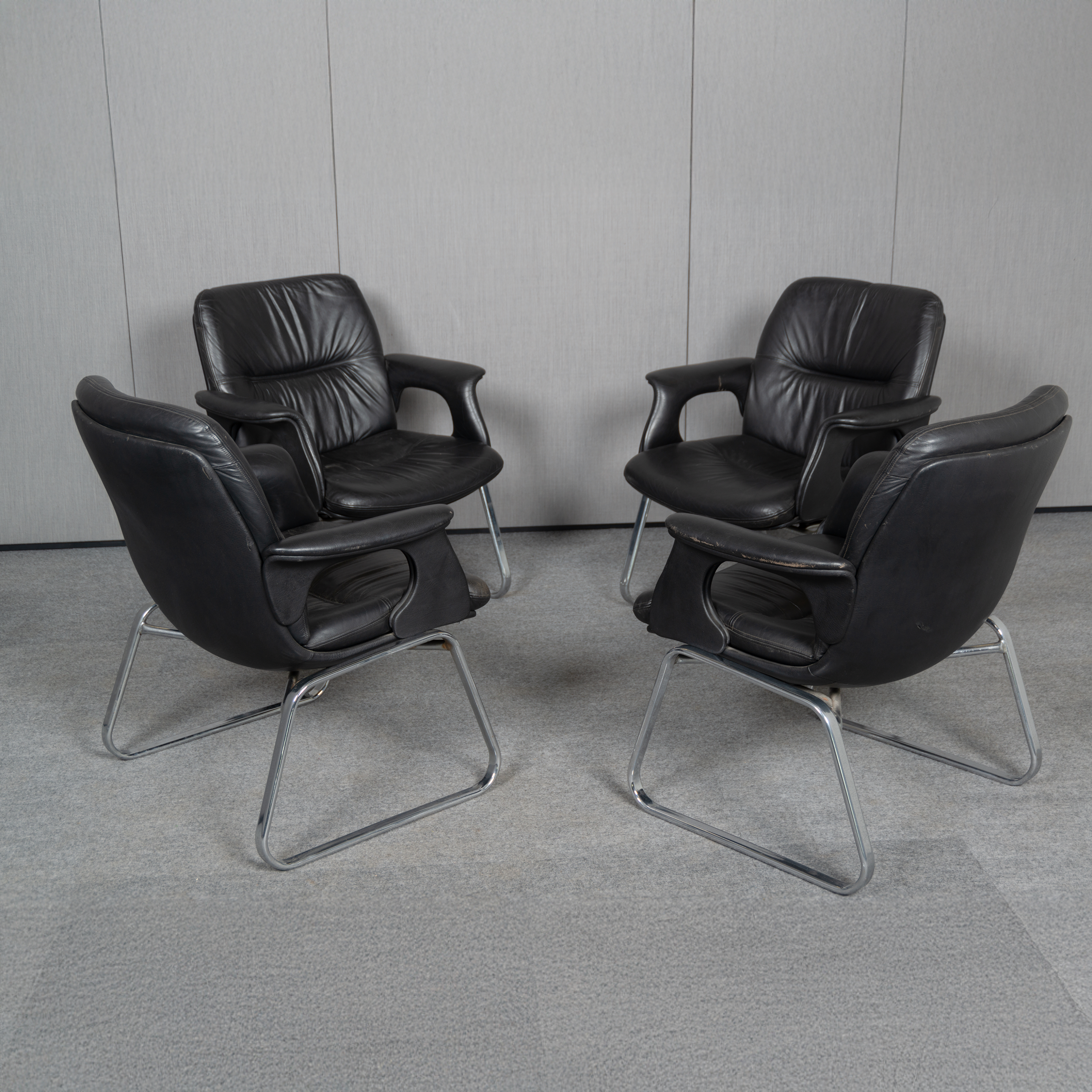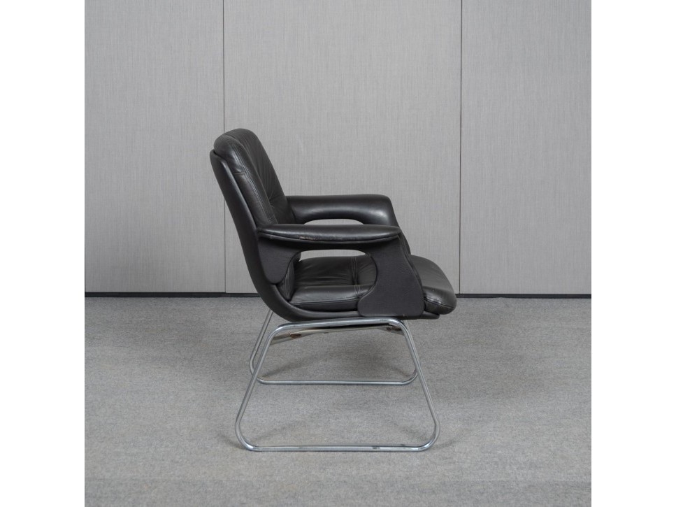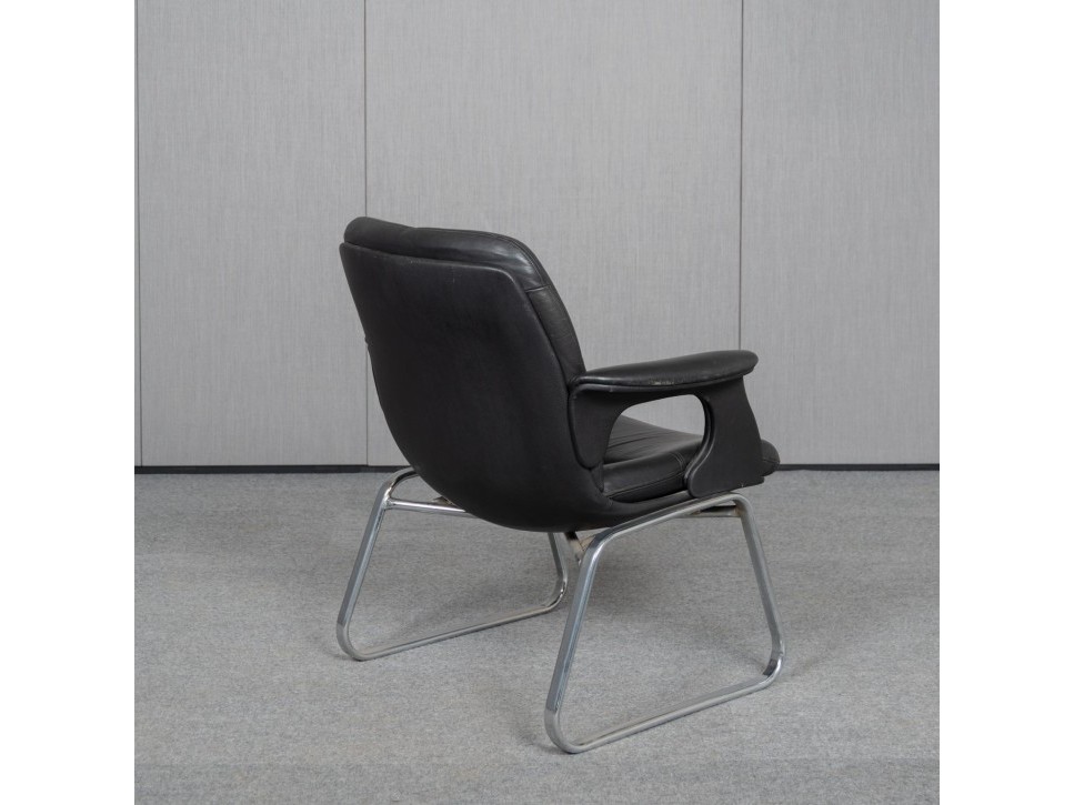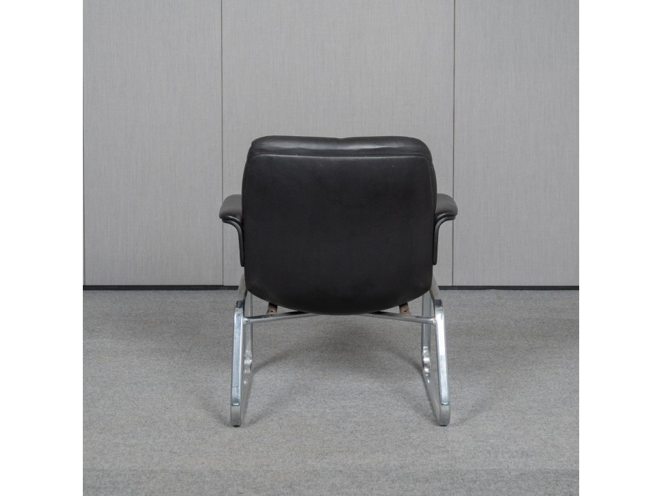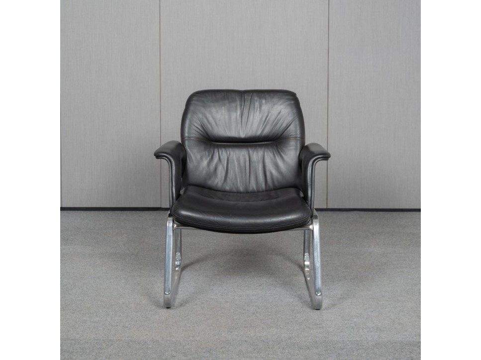 Der schwarze Lederbezug weist eine charakteristische Patina auf und betont das authentische Erscheinungsbild des Sessels. Durch die stabile Stahlrohrkonstruktion eignet sich das Modell sowohl für Wohnbereiche als auch Loungezonen.