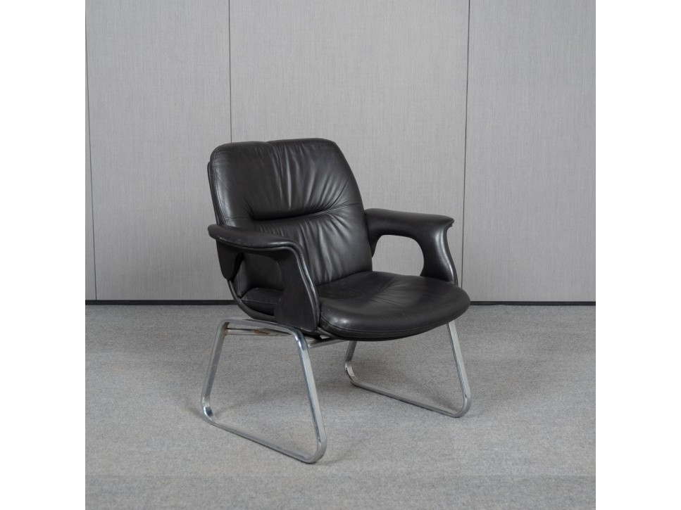 Dieser originale Loungesessel aus den 1970er Jahren kombiniert ein chromveredeltes Kufengestell mit einer vollgepolsterten Sitz- und Rückenfläche.