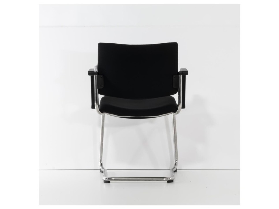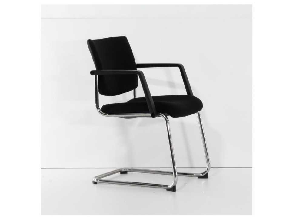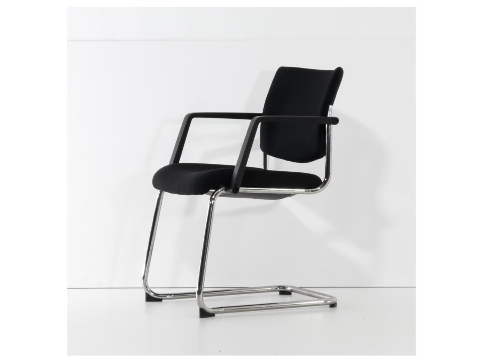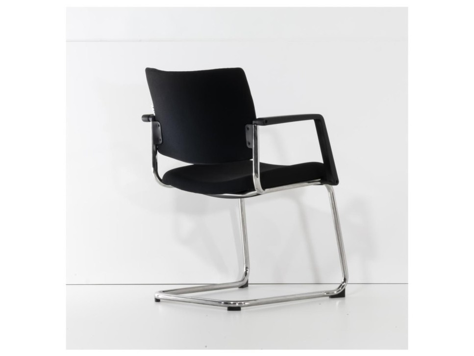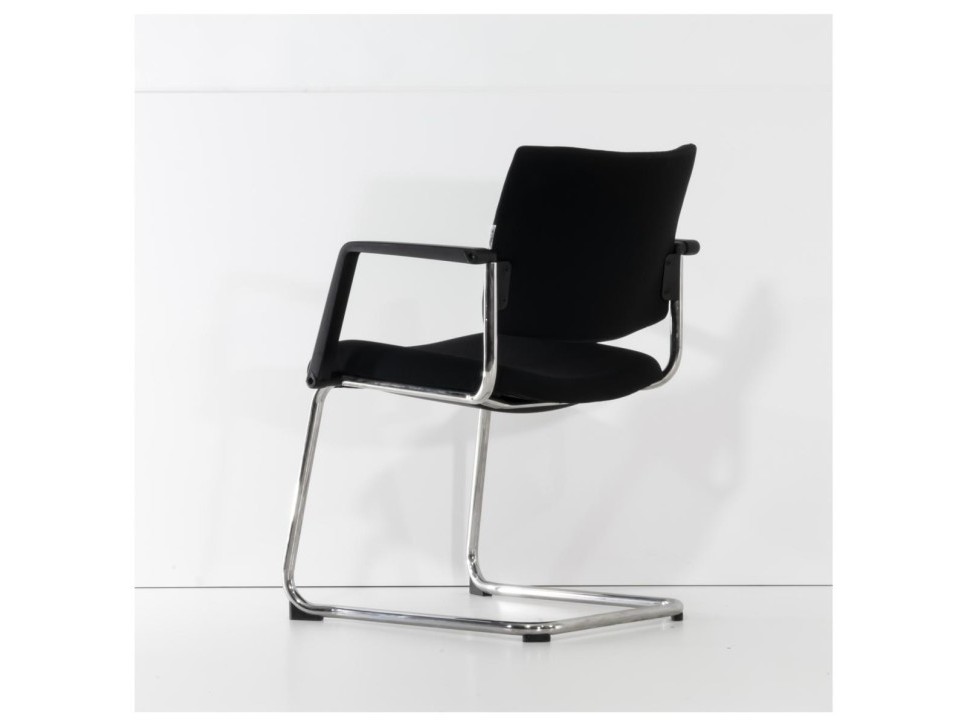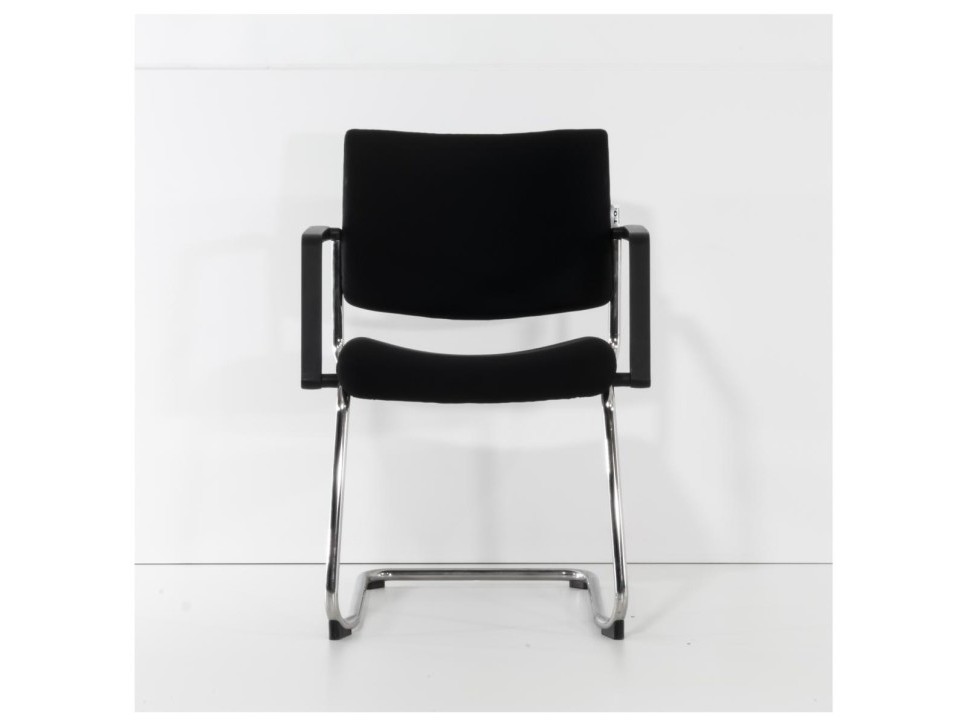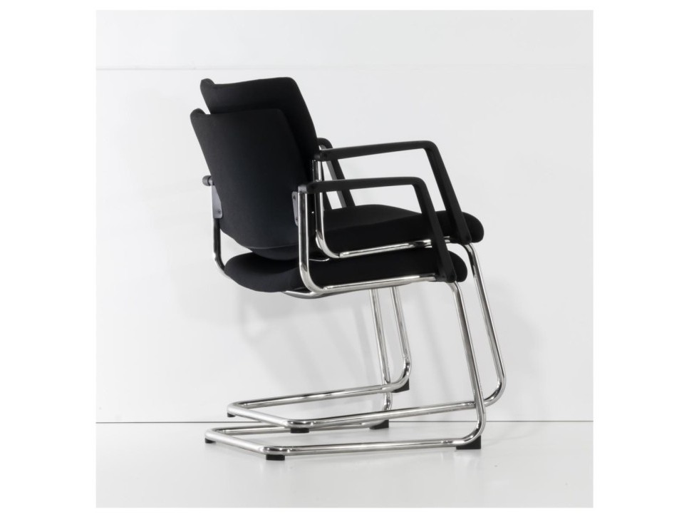 Das Freischwingergestell aus verchromtem Stahlrundrohr sorgt für Flexibilität und angenehme Federung beim Sitzen. Die integrierten Armlehnen sowie der frontseitige Kippschutz erhöhen den Komfort im Besprechungseinsatz.