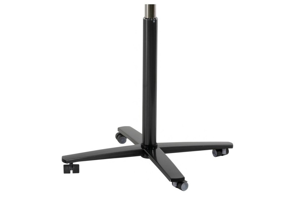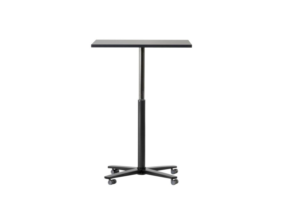 Die 25‑mm‑Tischplatte in Anthrazit ist melaminharzbeschichtet und bietet eine robuste, pflegeleichte Oberfläche. Das vierarmige Fußkreuz aus Metall gewährleistet Stabilität, während vier Rollen – zwei davon feststellbar – den mobilen Einsatz im Raum erleichtern.