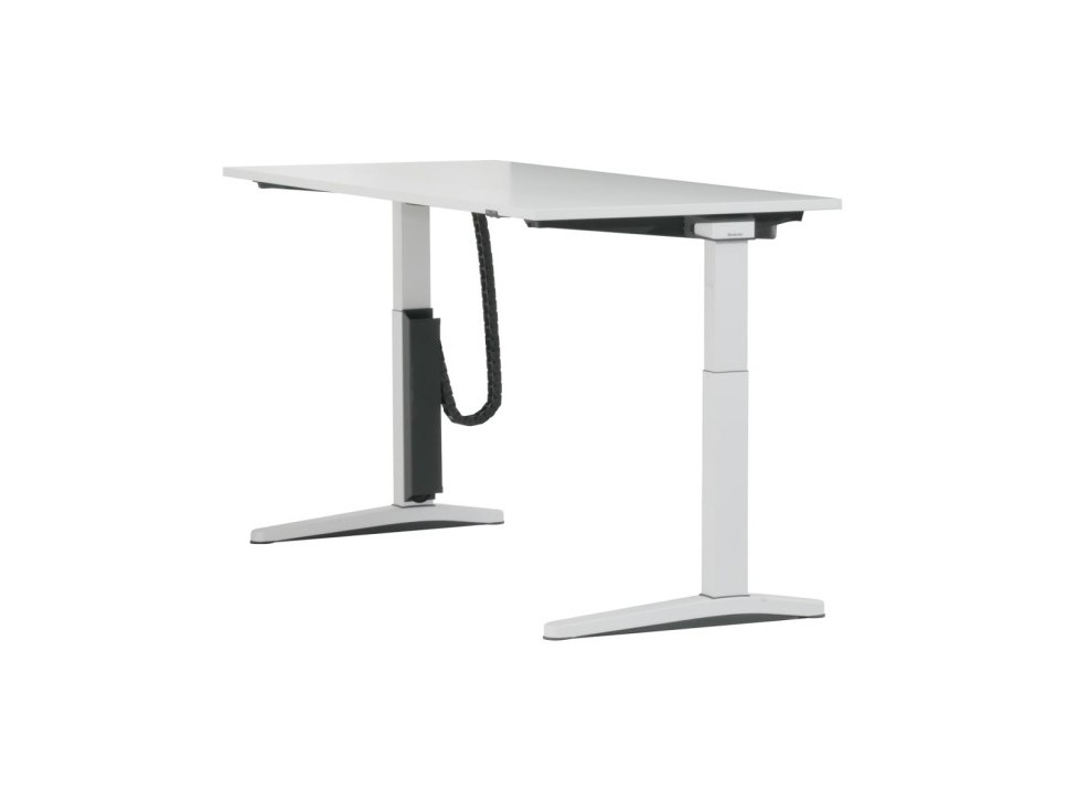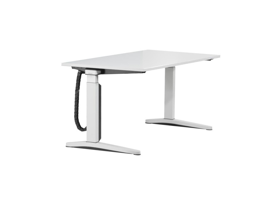 Das C-Fuß-Metallgestell in Weiß besitzt abgerundete Kufen und sorgt für hohe Stabilität. Die melaminharzbeschichtete Tischplatte ist in Weiß ausgeführt und verfügt über Kabeldurchlässe.