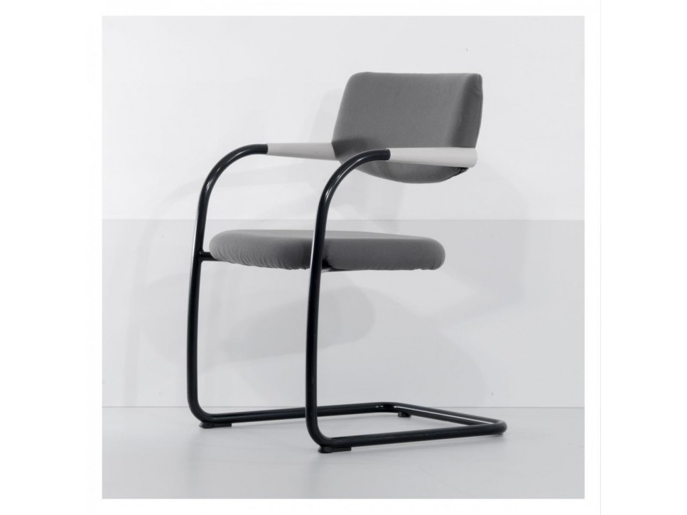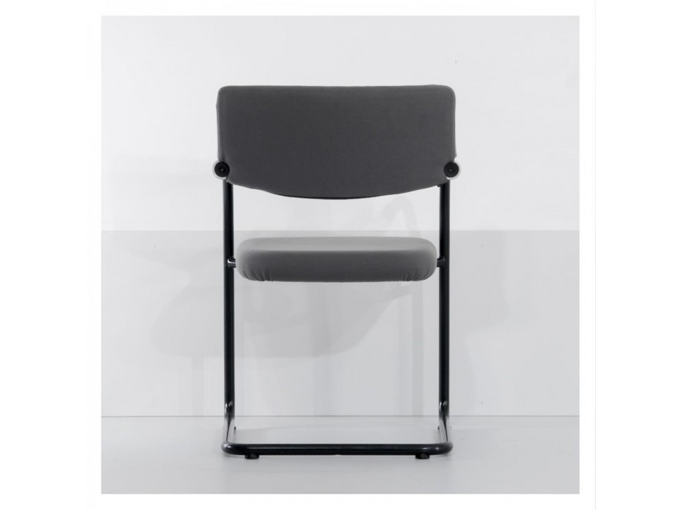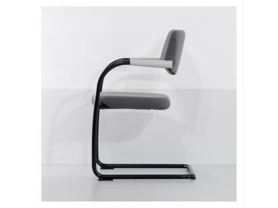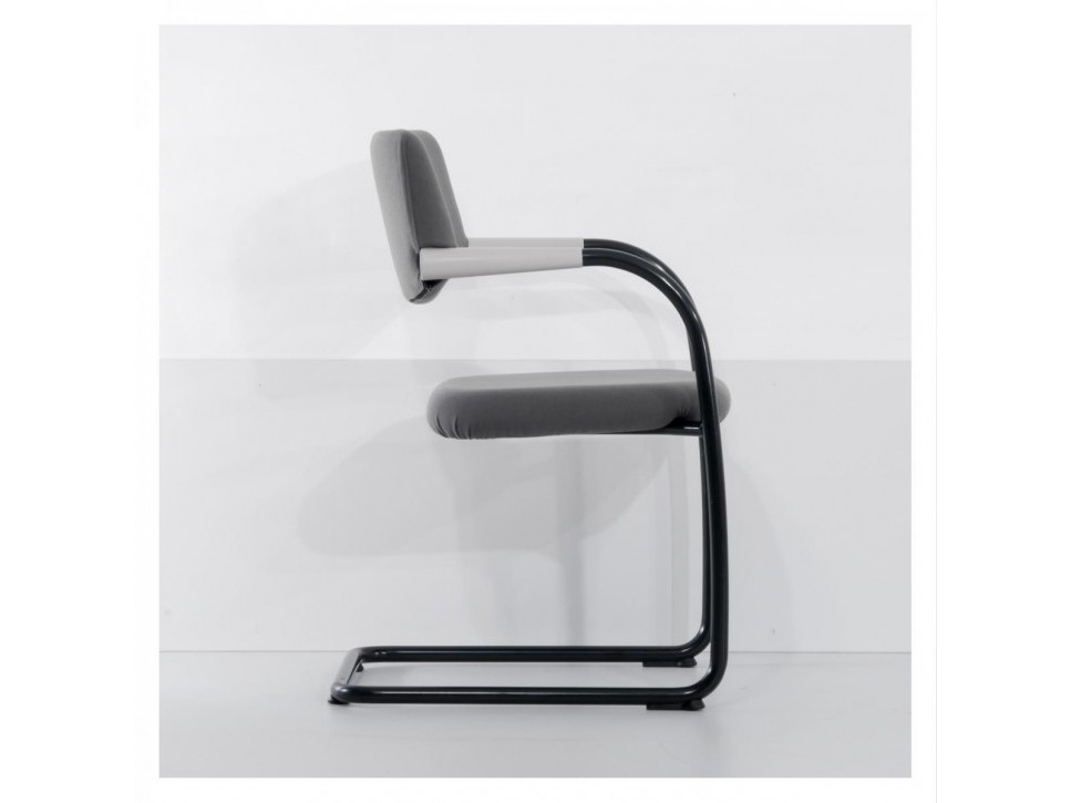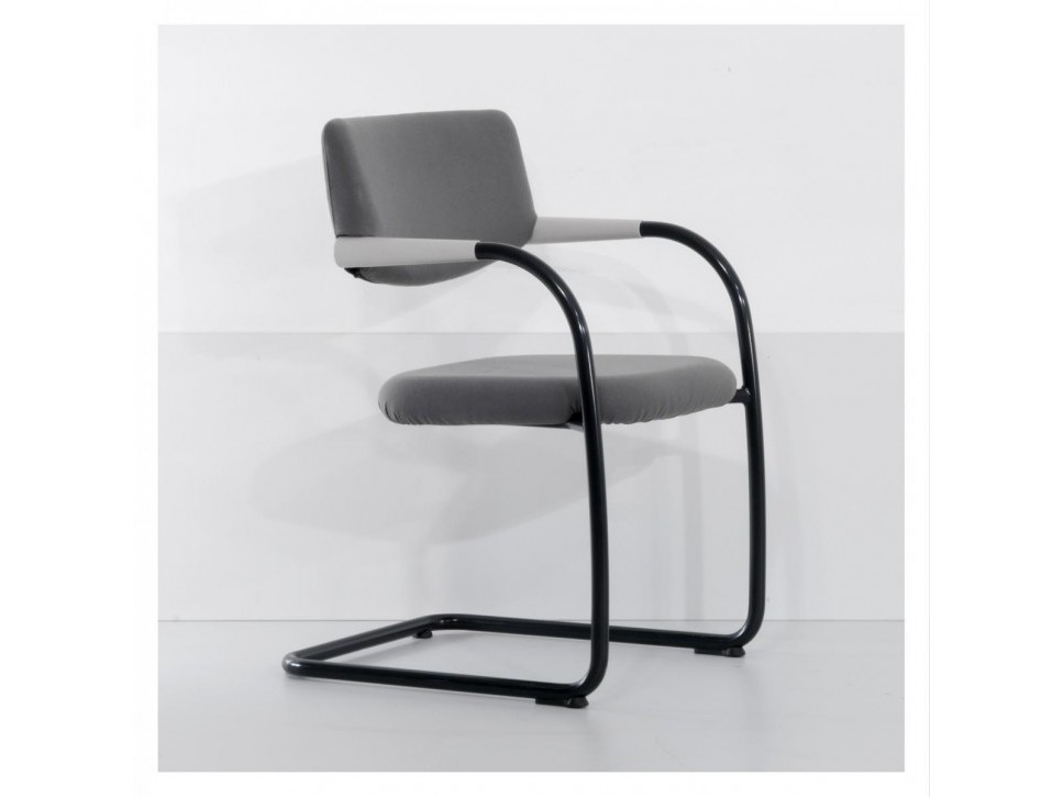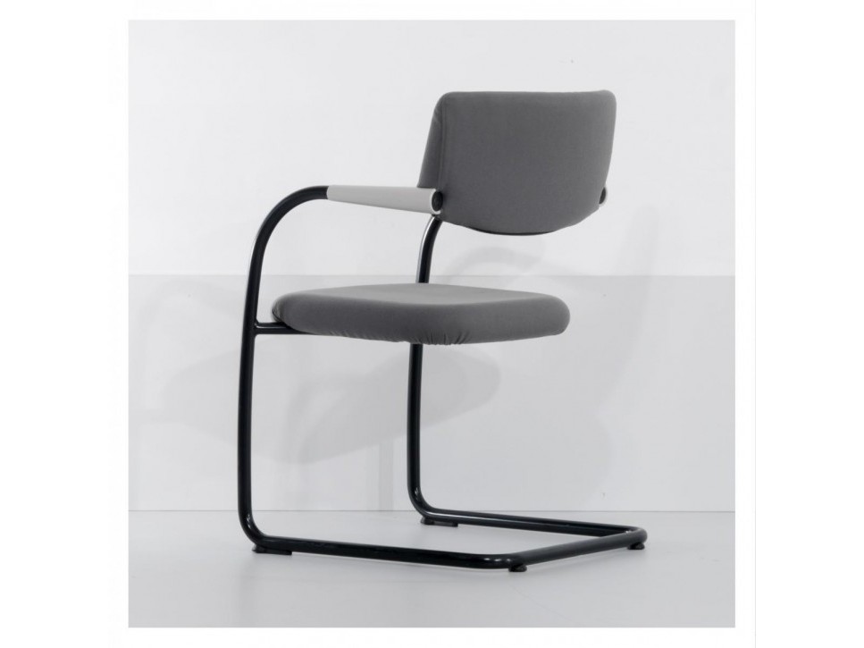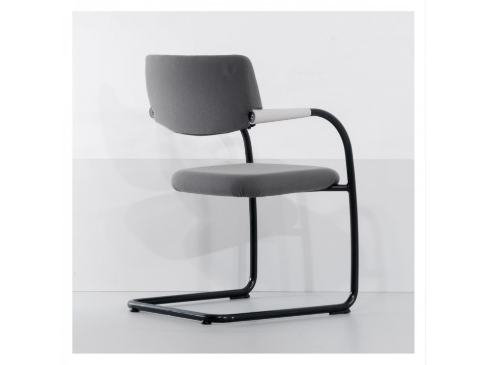 Die gepolsterte Sitz- und Rückenfläche ist mit einem grauen Stoffbezug ausgestattet und bietet auch bei längeren Besprechungen eine angenehme Unterstützung. Die schwebend wirkende Sitzfläche ruht auf einem stabilen Freischwingergestell aus schwarzem Stahlrundrohr, das eine leichte Federung ermöglicht.
