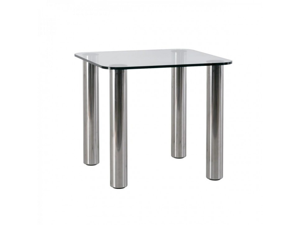 Die 15 mm starke Kristallglasplatte mit abgerundeten Ecken ruht auf einem vierbeinigen Edelstahlgestell, das Stabilität und eine puristische Linienführung vereint.